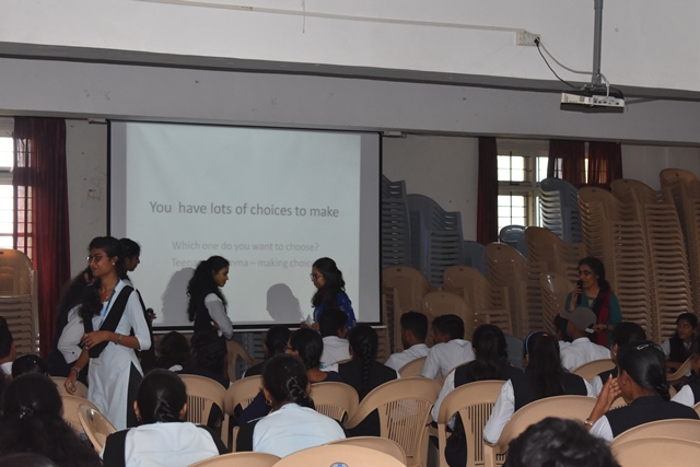 The session concluded on the discussions made in the groups and Dr Shalini gave her insights into what the students had pointed out .She emphasized on making oneself aware of the choices and thinking over it ,forcing the brain to think about all the choices and choose the one that is right. If incase the individual isn’t in a position to take any decision ,to seek help from parents, teachers and older members in the society. She asked the students to keep in mind certain things while making a choice such as If I make a choice will it be against my parental values / teachers/my values /against the law ,Is it safe for me and others ? ,Will I get into trouble ? , Will it disappoint my parents and teachers ?
