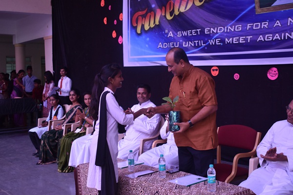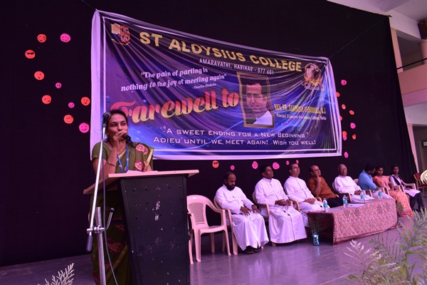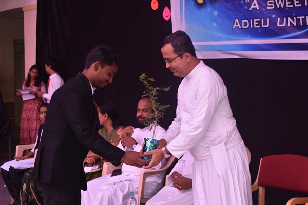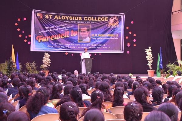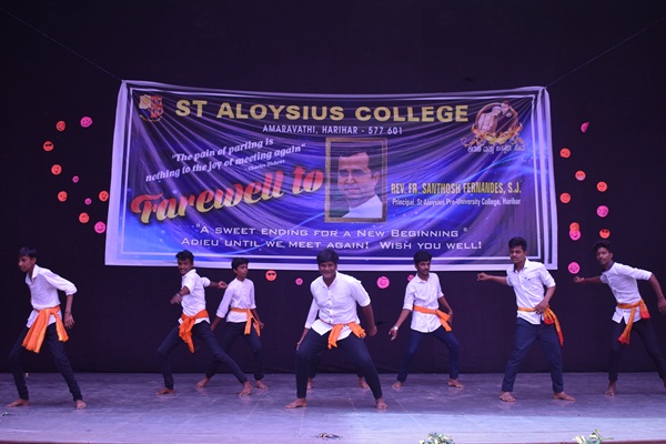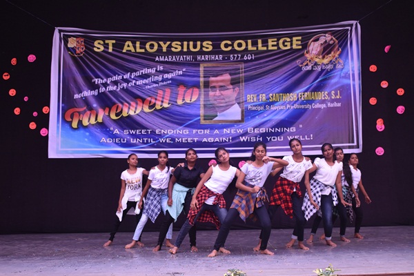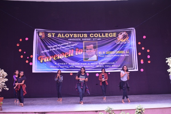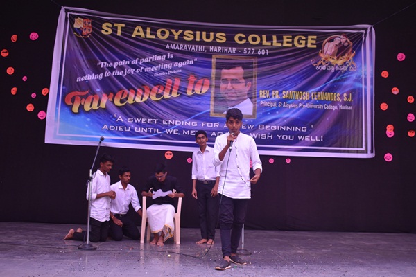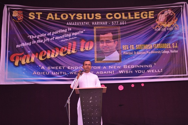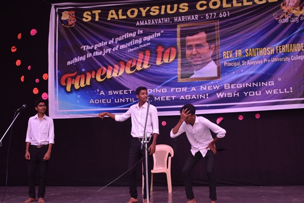 Students of second PUC and degree performed a humorous skit which was led by Shashank. Skit was followed by an entertaining dance performance by the hostel girls they captured the hearts of all audience. Cultural programme came to an end with the dance performance. Fr Dionysius Vaz SJ delivered the presidential address. As a rector of the college he spoke about his experience working with Fr Santhosh. He appreciated Fr Santhosh for all his hard works. He said that earlier he didn't find much happy while coming to the college because of the less number of students but now he enjoys coming to college because of the high number of students. This happened because of the hard work of both the principals. He concluded his speech by saying that more programme will be given for the students in order to bring out their talents. Programme came to an end by vote of thanks which was delivered by Alwyn Alfred of first PU commerce. Students bid Adieu to the best principal who always helped, supported and shaped the lives of many students.