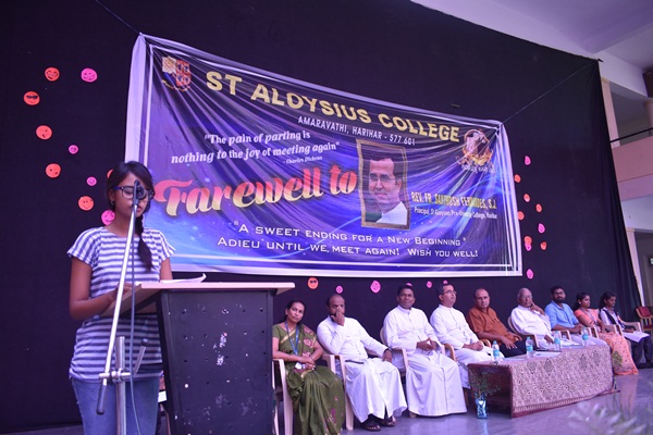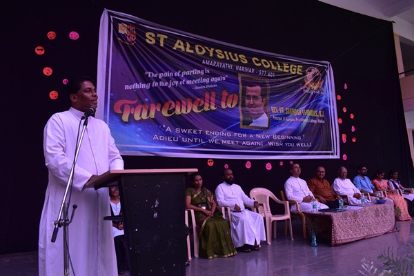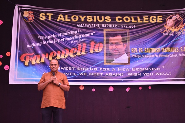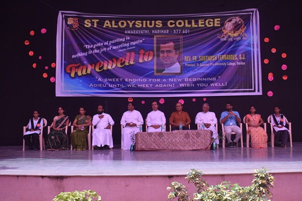 Harihar: The students of St Aloysius college Harihar bid farewell to Fr Santhosh Fernandes SJ principal of PU college on 20th of August, 2019. It was a bright sunny day but for the students and staffs it was a gloomy day where the air was filled with emotions. The guests for the day were Rev.Fr Dionysius Vaz SJ rector of St Aloysius College and vice principal of Mangalore Jesuit education society, Fr Eric Mathias SJ principal and superior of degree college, Fr Santhosh Fernandes SJ principal of PU college, Fr Pradeep Sequeira SJ finance officer of St Aloysius college, Fr Cyril Raj vice principal of degree college, Ms Demora Valsin Pereira and Ms Deepashree lecturers and coordinators of the programme.