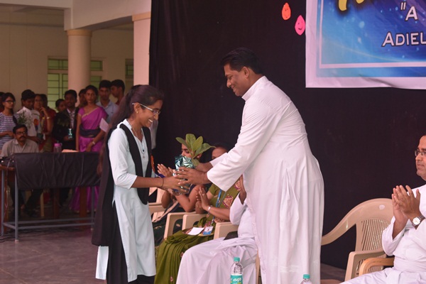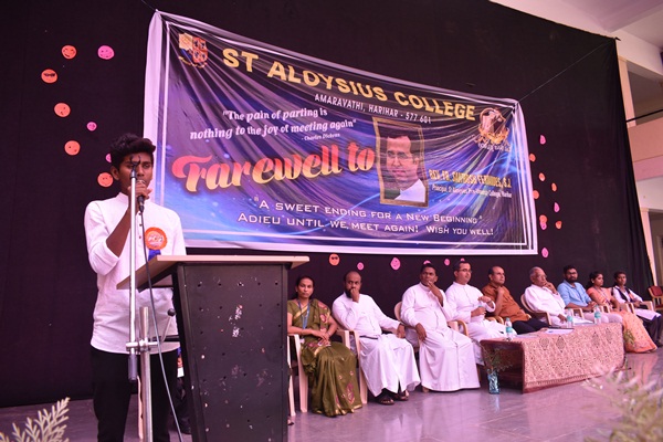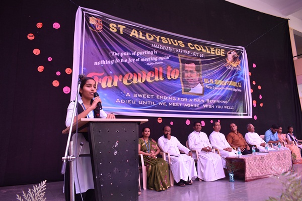 Dance is the hidden language of the soul. Students of first PUC mesmerized the audience with an energetic Dance performance. Dance was followed by a speech by Fr Santhosh Fernandes SJ the most awaited speech in the whole programme. First and foremost, he shared his experience working as a Principal in Aloysius for the fast five years. Fr Santhosh took the audience back to five years where he started his work. After narrating his own experience, he gave a message to the students regarding the importance of education through a story. The story was about a boy who has gone to attend an interview. He cleared all the rounds and at the end he had an interview with a person who is in higher rank. He answered all the intellectual question but failed in an emotional question. The interviewer asks him "how many times you cared for your mother till today and how many times you enquired about her difficulties?" the boy replied 'No' for the questions. The interviewer told him to go home and see the hands of his mother. As soon as he reached home, he looked for his mother but mother was not there she was out for work. After five minutes she came back and the boy gently hold his mothers' hands and rubbed her hands and saw all the wounds then he applied medicines to the wound and at that time he felt the pain of his mother all these years. She never complained about anything she looked after him and cared for him but he couldn't do that in return. As a moral of this story Fr Santhosh gave a message to students that education without concern for your parents is of no use. Education should enlighten in all the ways.