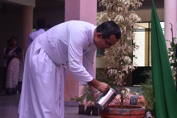 The day began with the students as well as the staffs welcoming the guests along with the College Band. The students of NCC escorted the guests towards the stage. The programme began with a prayer song led by Ms Deepthi D'souza. Anitha of first year B.com welcomed the gathering. The master of the ceremony Amar Katve and Varsha called upon all the guests to inaugurate the programme by watering the plant. Mrs Pushpalatha spoke about her delight working with Fr Santhosh for the past five years. Ms Annet spoke about her experience as a student under the guidance of Fr Santhosh. She said that the word Santhosh derived from Sanskrit word meaning contentment, happiness and satisfaction and she added that all these characteristics are clearly depicted in the life of Fr Santhosh. Ms Revathi of second PU commerce shared her opinion about Fr Santhosh regarding what she learned from him and the cheerfulness and smile on his face which brightens up all the students. All the words in this universe won't be able to express the feelings of the students. As Hans Christian Andersen said "where words fail, music speaks." Students of first PUC came up with a wishing song which was led by Shobha Monis lecturer of English.