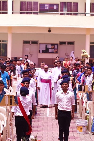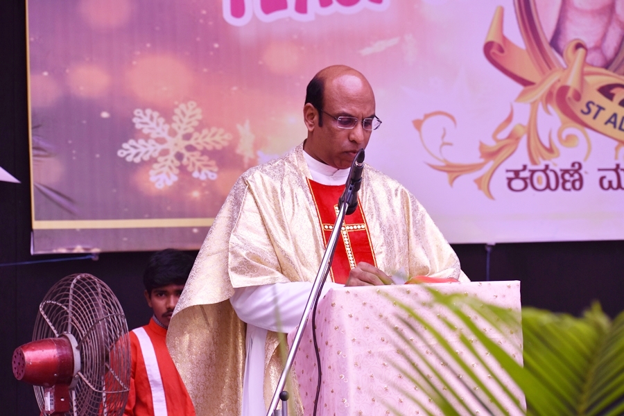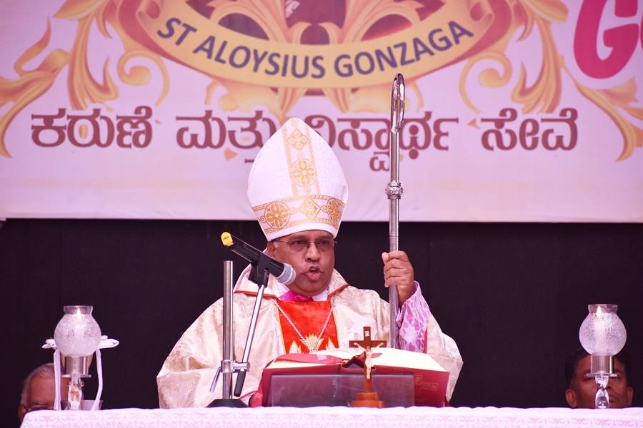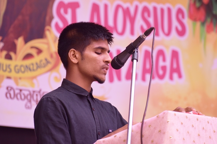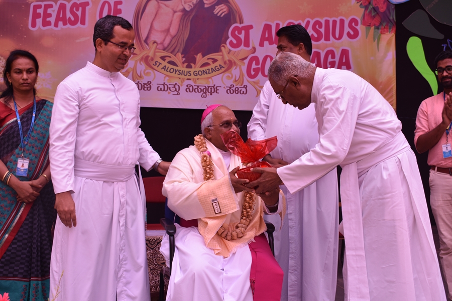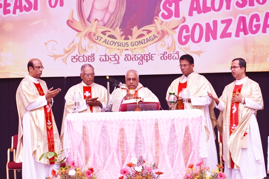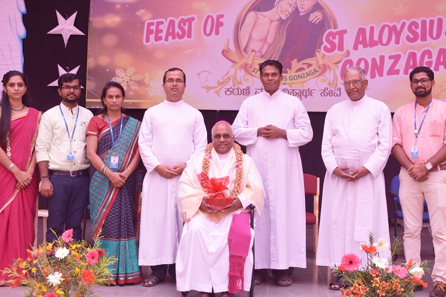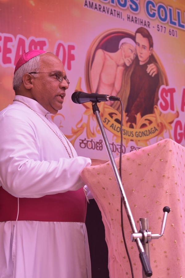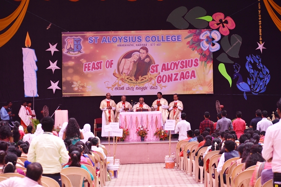 The day began with mass celebrated by the most Reverent Bishop Francis Serrao SJ, Bishop of Shivmoga Diocese; concelebrated by Fr. Antony Peter, parish priest of Harihar church; Fr. Eric Mathias SJ, superior and Principal of Aloysius degree college; Fr. Santhosh Fernades SJ, principal of Aloysius PU college and Fr. Padeep Sequira, finance officer of Aloysius college, Harihar. In the sermon, the Bishop narrated and briefed the life of St. Aloysius Gonzaga, while giving a few values of St. Aloysius that every Aloysian should follow.